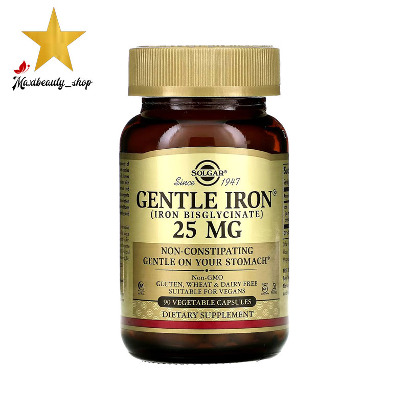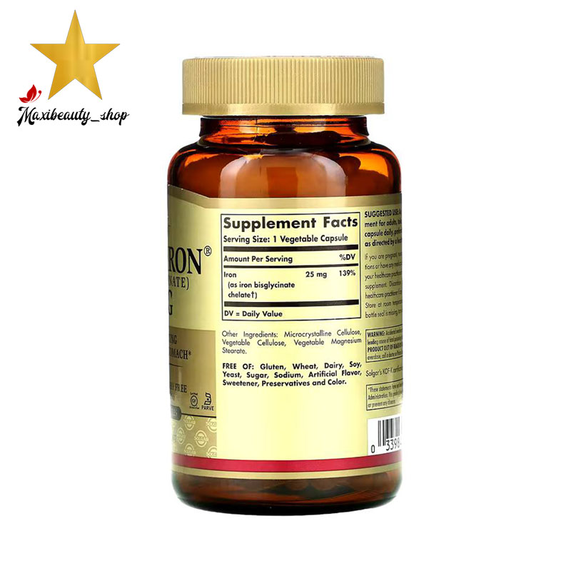 Solgar در هر کپسول گیاهی آهن (فروس بیس گلیسینات)25 میلی گرم است. آهن به تشکیل طبیعی گلبول های قرمز و هموگلوبین کمک می کند. آهن به انتقال طبیعی اکسیژن و متابولیسم طبیعی تولید انرژی در بدن کمک می کند. مکمل آهن Solgar با اجتناب از سولفات آهن که در بسیاری از مکمل های آهن دیگر یافت می شود، خود را متمایز می کند. حاوی مواد حساسیت زا مانند مخمر، گندم، گلوتن، سویا و محصولات لبنی نیست.