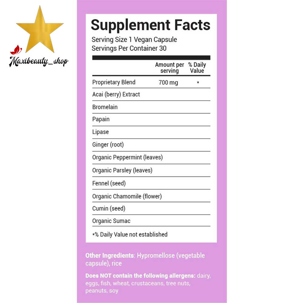 این مکمل با وجود آنزیم های که به هضم و لاغری کمک می‌کند،مشکلات گوارشی مربوط به هورمون ها و غذا مثل(ورم،نفخ،دردشکم) رو رفع میکنه.